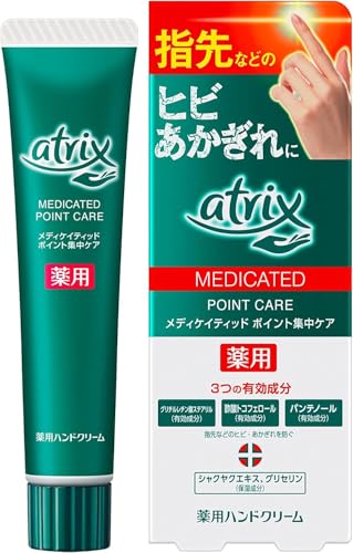atrix(アトリックス)のエクストラ ポイント集中ケアは、指先のヒビやあかぎれに特化した薬用ハンドクリームです。3つの有効成分、グリチルレチン酸ステアリル、酢酸トコフェロール、パンテノールが角層の深い部分まで浸透。これにより、手の荒れやダメージを集中的にケアします。